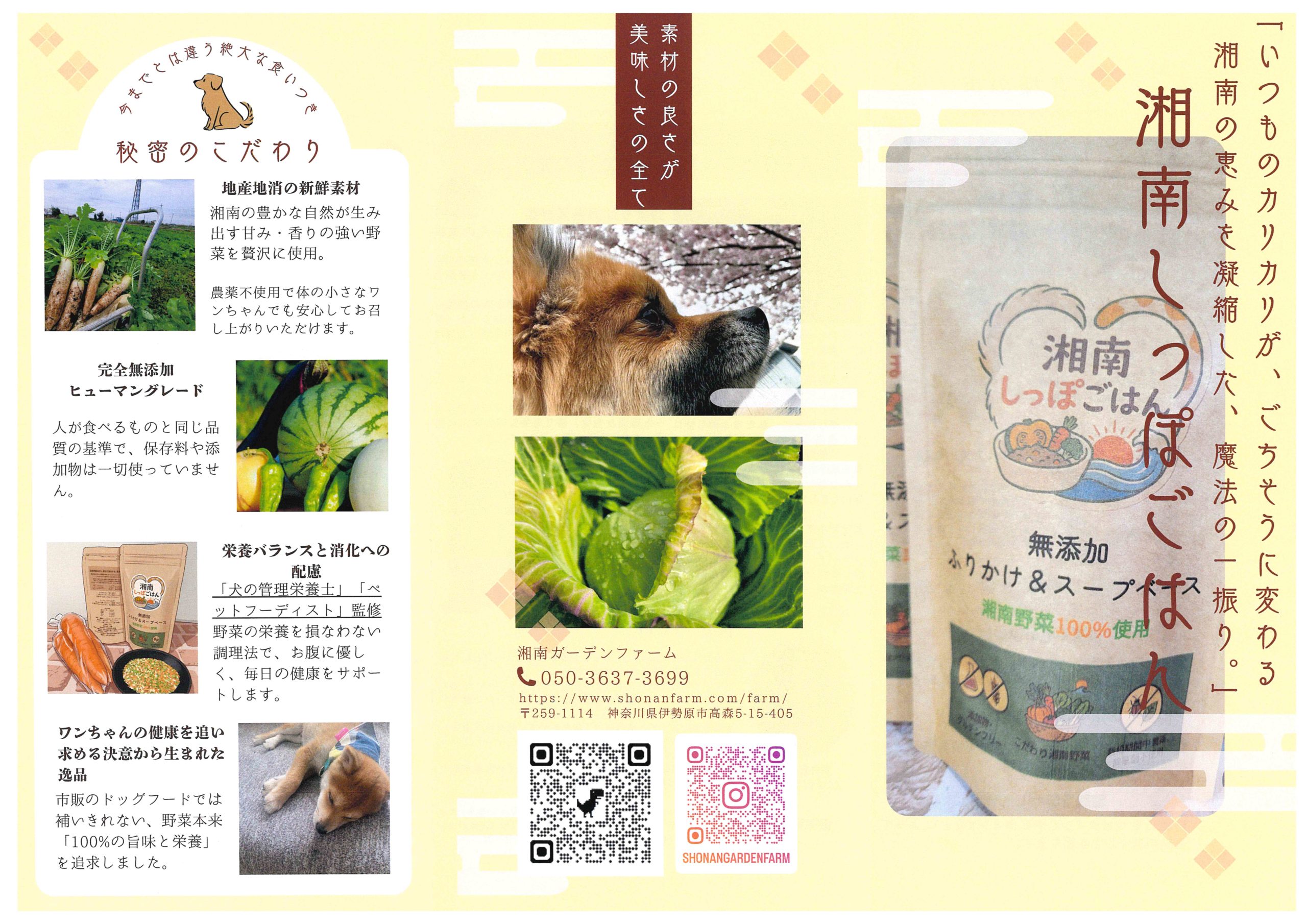 シリウスに野菜を提供して頂いている伊勢原の齋藤農園代表の齋藤治篤さんが新事業を立ち上げ頑張っています、まだ食べられるけど捨てなければならない状況で、もったいないから生まれました、興味のある方は、是非大事なワンニャンさんにお試しください、連絡先はパンフレット参照下さい