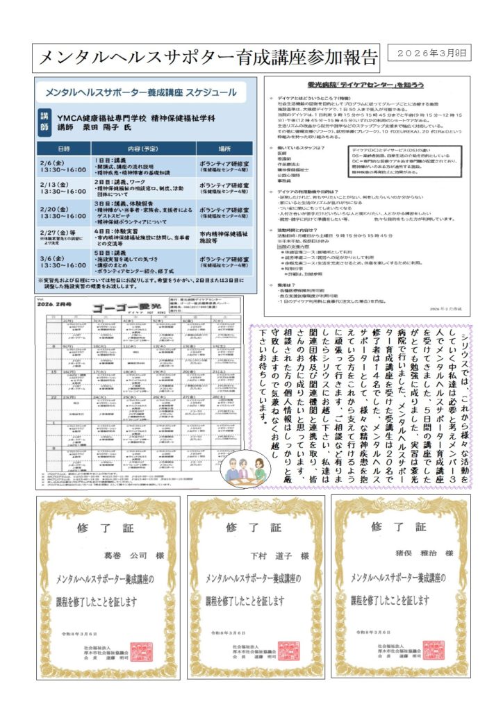 blogメンタルヘルスサポター育成講座参加報告 シリウスでは3人で育成講座に参加しました、5日間で実習も有りとても勉強になりました、今後はサポータとして頑張って行きます。 メンタルヘルスサポター育成講座参加報告 投稿を読む »