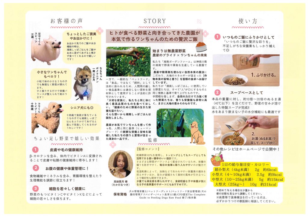 シリウスに野菜を提供して頂いている伊勢原の齋藤農園代表の齋藤治篤さんが新事業を立ち上げ頑張っています、まだ食べられるけど捨てなければならない状況で、もったいないから生まれました、興味のある方は、是非大事なワンニャンさんにお試しください、連絡先はパンフレット参照下さい